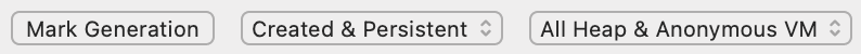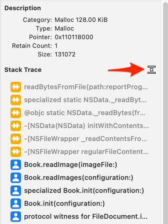 The Allocation Type menu is the rightmost menu in the following image: The extended detail view shows the call stack. Clicking the button at the top right of the call stack list hides system libraries to help find your code in the call stack. Double-click a function from the call stack to see the lines of code that allocated memory. Make sure you double-click a function you wrote or else you'll see assembly language functions instead of source code. |